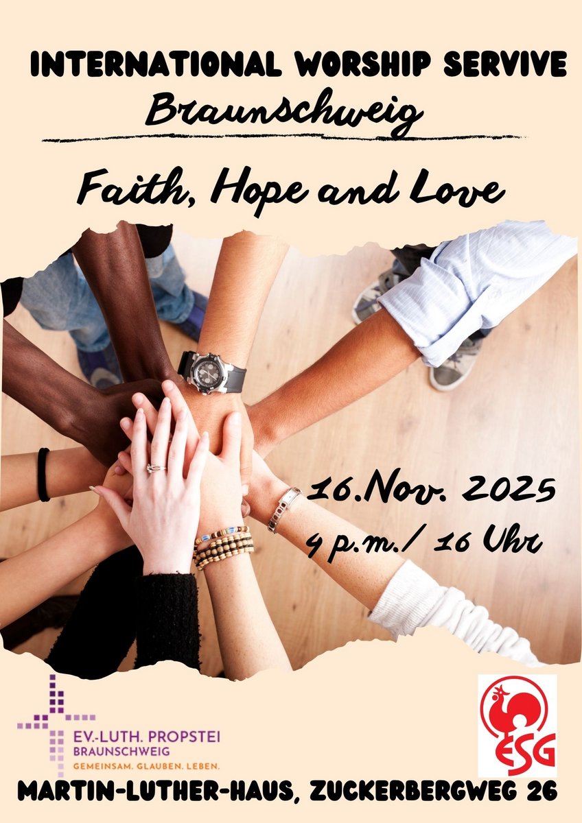 Die Propstei Braunschweig lädt in Zusammenarbeit mit der Evangelischen Studierendengemeinde zum zweiten internationalen Gottesdienst ein. „Glaube, Hoffnung Liebe“ stehen im Mittelpunkt der biblischen Texte, der Musik und der Predigt, in der unterschiedliche, internationale Perspektiven zur Sprache kommen. Sie sind die Wege, die wir in der Begegnung miteinander als Brücke und Fundament im gemeinsamen Glauben an Jesus Christus gehen wollen. Wir freuen uns wenn Sie und Du dabei sein können: am 16. November um 16.00 Uhr im Martin-Luther-Haus im Zuckerbergweg 26, Braunschweig.