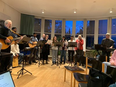 The singing was led by pop-cantor of the Ev.-luth. Landeskirche Karsten Russ (in the picture on the right side), and accompanied by a small band from the Biblical Encounters Group, the ESG and St. Johannis.